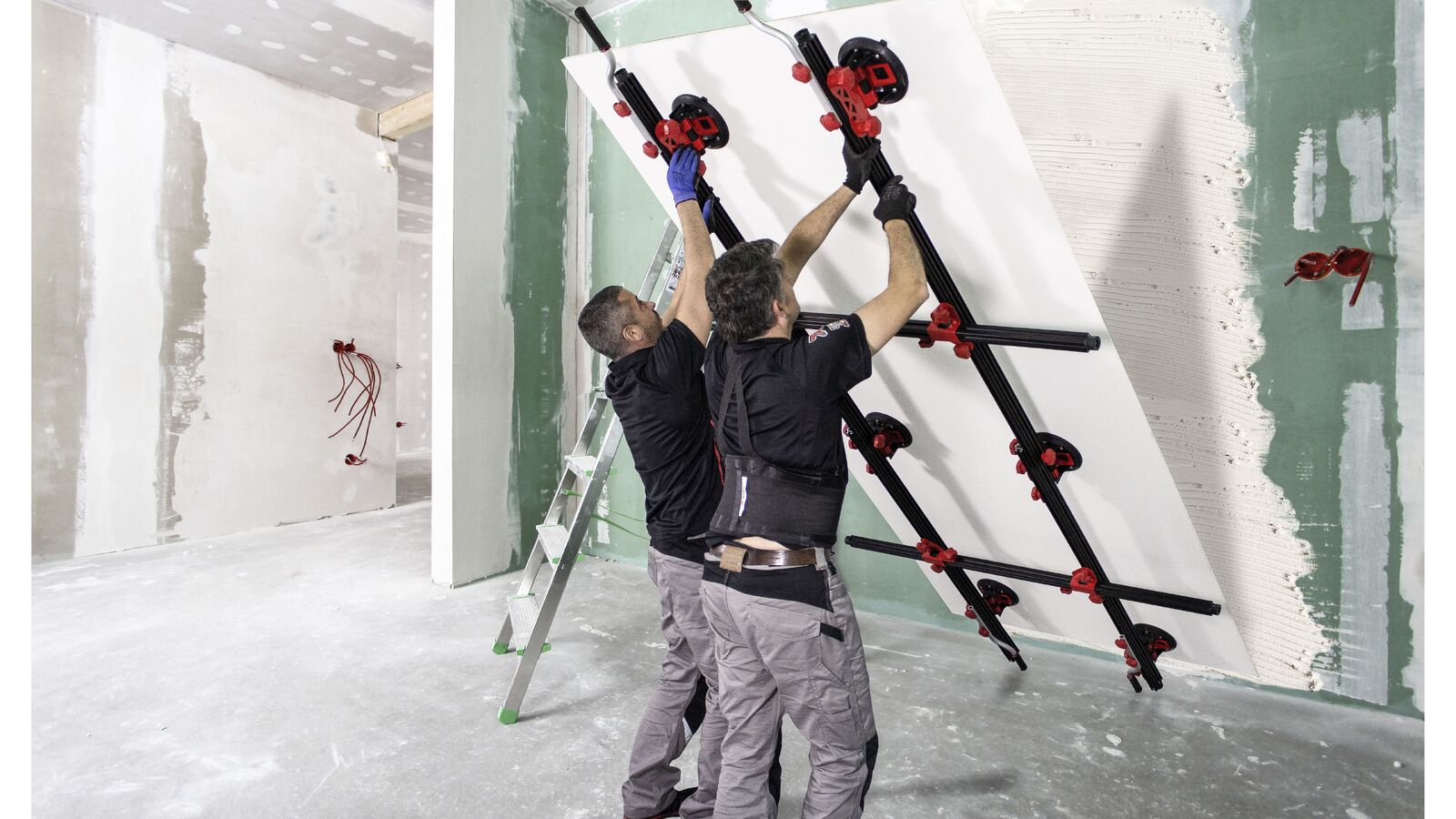 It consists of a set of two profiles of extruded aluminium, reinforced, retractable and adjustable from 160cm to 320cm and two perpendicular crossbeams that gives the robustness and stability of the whole system, particularly during the handling of the heaviest pieces. Thanks to the 6 vacuum cups, the fixer can adjust the fixing points that ensures the security in the handling of the material being lifted. For a correct fixation of the system, the surface must be clean of dust or other debris.